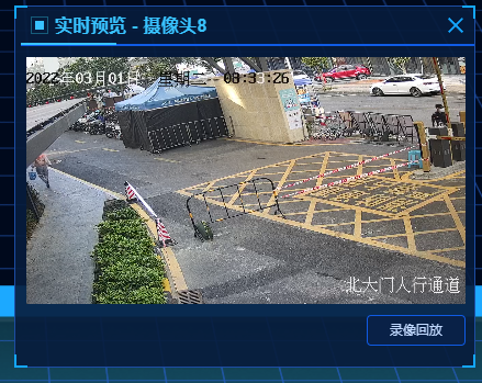 当摄像头设备包含录像回放参数时,实时预览窗口右下角将出现“录像回放”按钮。点击“录像回放”按钮,将打开录像回放窗口。